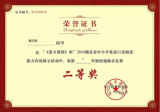 2018年对于还是三年级的我,才刚刚接触英语,跟Aryn老师跟读练习一段时间后,在“口语100”举办的《英才教程杯》2018年湖北省中小学英语口语朗读能力在线展示活动中,学校英语老师让我报名参加。很快我通过了海选,参加了地级市复赛,并在复赛中取得了二等奖的好成绩。学校老师为我颁发了奖状,同学们对我投来了羡慕的眼光,但我知道这都是你的功劳,我的好老师——Aryn老师。